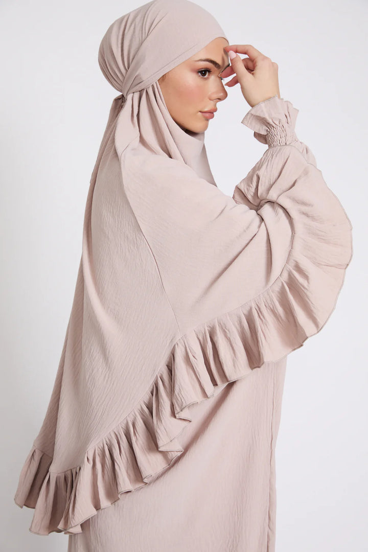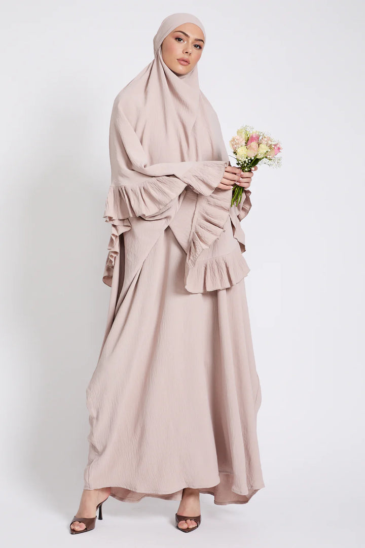 The abaya features elegant ruffle sleeve detailing, adding a soft feminine charm, while the matching khimar is adorned with delicate frills along the edges for a refined, graceful finish.