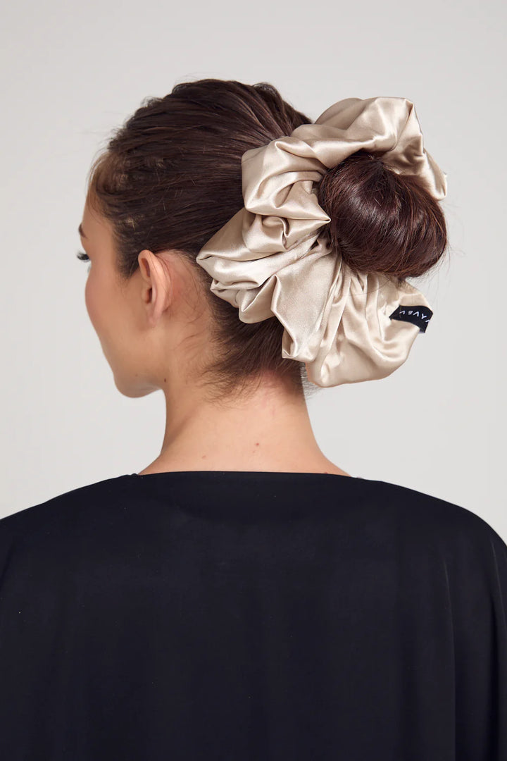 The satin material glides effortlessly, reducing frizz and creating a smooth silhouette, while the scrunchie’s structure adds natural volume and fullness to your hijab style. It combines elegance with functionality, offering both style and hair protection throughout the day.
